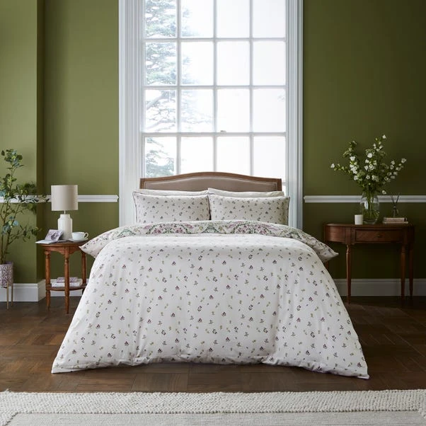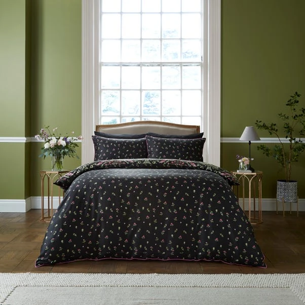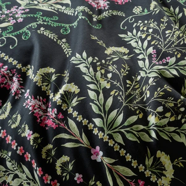 Infuse your bedroom with a touch of opulence with the Dorma Botanical Panel Duvet and Pillowcase Set. This luxurious bedding, crafted from 100% cotton sateen with a 300 thread count, features a striking botanical pattern set against a bold backdrop. The intricate flora and fauna design creates a dramatic and sophisticated look, enhanced by classic border details and picture frame pillowcases. The reverse side reveals a delicate floral motif, adding versatility to your decor. Easy to care for and machine washable, this premium bedding promises a restful and stylish sleep experience.