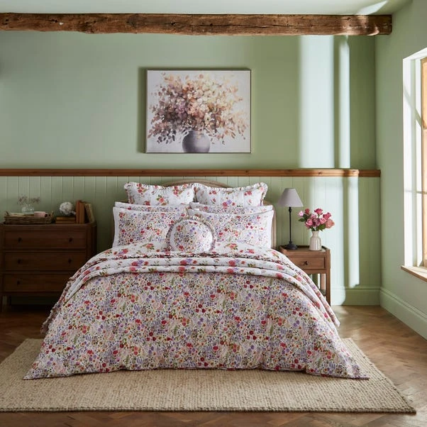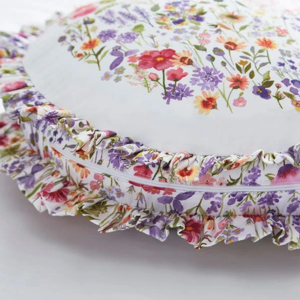 Bring the beauty of countryside flower meadows into your home with our colorful floral print round cushion, featuring a ruffle edge and crafted from luxurious 100% cotton sateen with a 300 thread count. Complete your decor with coordinating curtains, bedding, pillow shams, sheets, bedspread, and bolster pillowcase for a harmonious look.